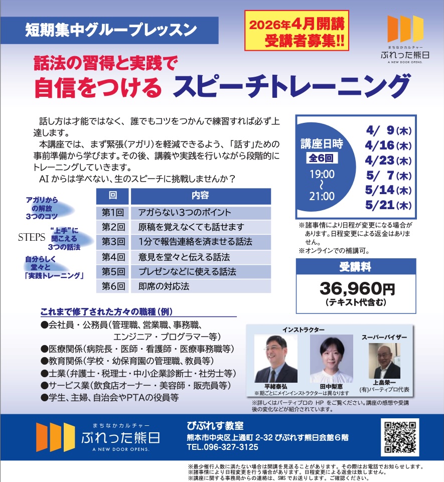 熊本市のスピーチ・挨拶・オンライン対応の個人レッスン、企業研修のパーティープロ